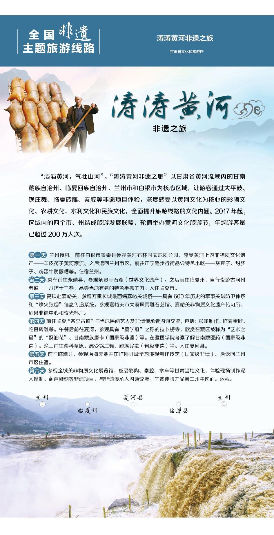 中國甘肅網(wǎng)10月19日訊 (本網(wǎng)記者 張?zhí)m琴)10月18日,在貴州舉辦的“中國丹寨非遺周”活動期間,文旅部首次發(fā)布了“全國非遺主題旅游線路征集宣傳活動”入選線路名單。由甘肅省文旅廳組織選送的“交響絲路非遺之旅”和“濤濤黃河非遺之旅”2條非遺主題旅游線路同時入選,我省成為全國唯一入選兩條線路的省份。