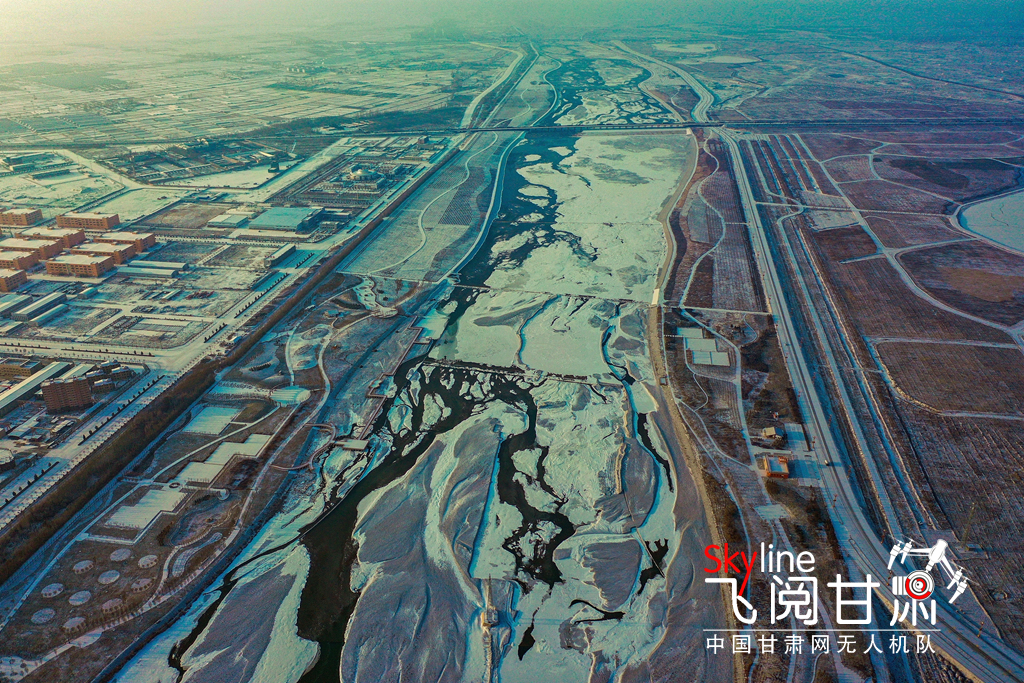 12月2日,雪霽天晴,冰封的黑河和漸凍的蘆水灣湖面上,皚皚白雪與裸露的水面形成丹青畫卷,別有一番趣味。(無人機照片)