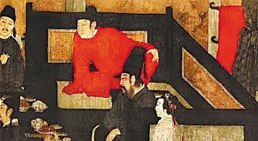 又如《韓熙載夜宴圖》中,圍子床后面的布簾旁,露出雙層黑漆衣架的形狀,上搭紅袍。