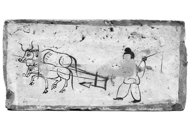 牛耕圖的兩頭牛也不尋常,畫得很傳神。白磚,橘紅色勾邊為框。墨線白描出兩頭牛,一頭健壯,似是公牛,一頭痩勁,似是母牛。痩勁之牛,能看到腿,牛腿使勁,一蹄前行,眼神炯炯,盯著前方,奮力前行。健壯之牛,在里面,看不到牛腿,但脖子稍彎,似乎看著觀看壁畫磚的觀眾,這還不算,它不時(shí)回眸一瞥,給你賣個(gè)萌。