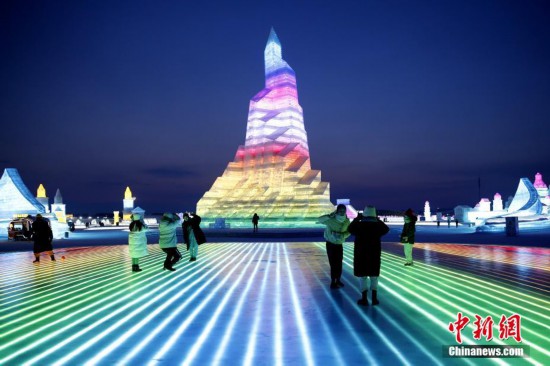 2月21日,游客在3D感應(yīng)冰面上拍照。連日來,冰雪大世界的客流量迎來小高峰,單日客流量可達(dá)四五千人。 中新社記者 姜輝 攝