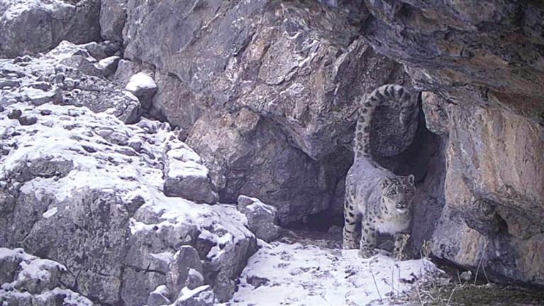 視頻中,這只雪豹巡視著自己的領(lǐng)地,并在鏡頭前留下了自己的氣味標(biāo)記。據(jù)陸橋生態(tài)中心雪豹研究團隊李祎斌判斷,這是一只雄性成年雪豹。