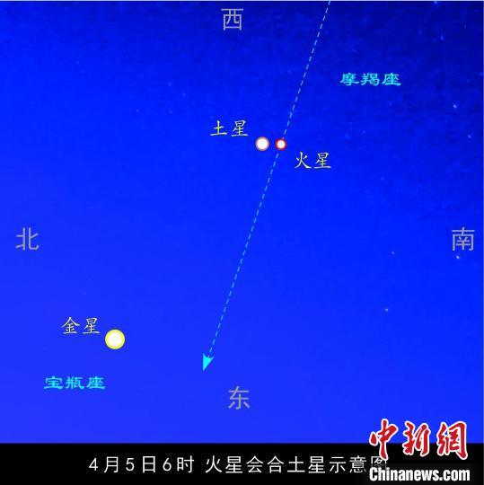 天文專家介紹稱,近日,火星和土星都位于摩羯座,火星由西向東追趕著土星。4月4日,火星將出現(xiàn)在土星的西南面,兩者相距0.9度;4月5日6時,火星將追上土星,二者位于同一條經(jīng)線上,兩者相距0.3度。但這還不是二者最短的距離,根據(jù)理論計算,再過幾個小時,火星和土星才距離最近。圓圓的滿月的視直徑約為0.5度,如果滿月在火星和土星的前面經(jīng)過,就可把它倆全部遮掩。4月6日,火星在土星東南面,兩者相距0.6度。