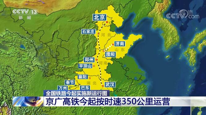 京廣高鐵從北京至武漢這一段,今天起按時速350公里運(yùn)營,新型復(fù)興號智能動車組列車上線。從北京到武漢,旅行時間縮短到4小時以內(nèi)。