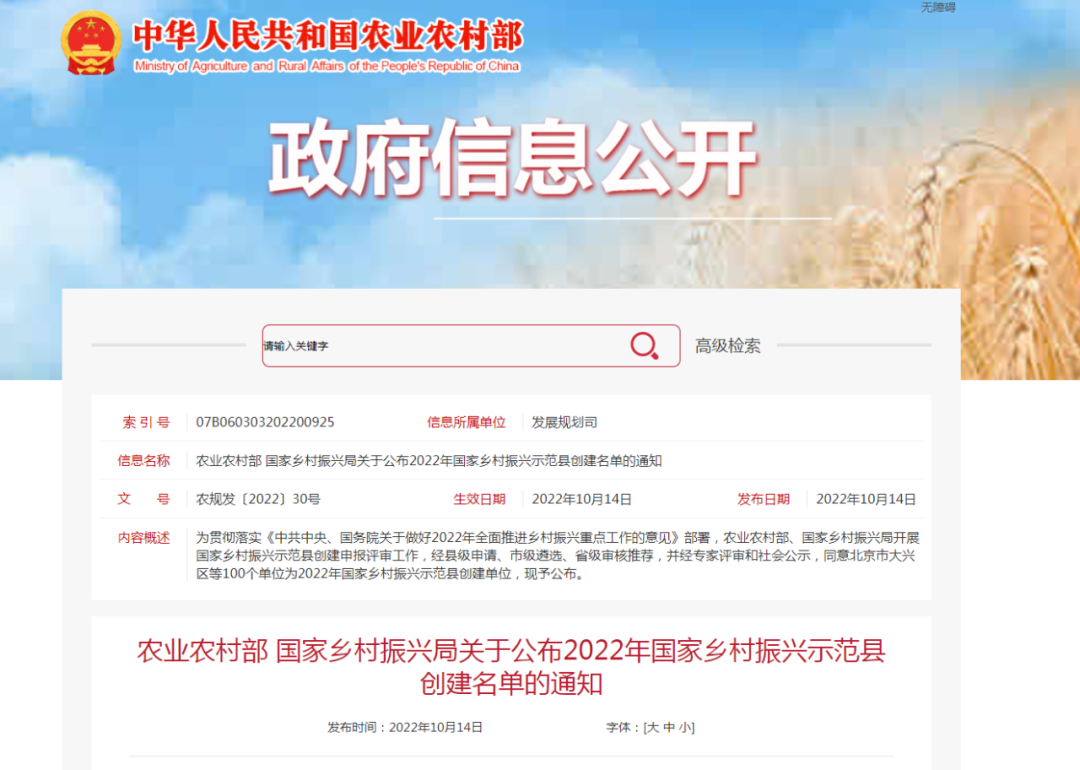 農(nóng)業(yè)農(nóng)村部、國(guó)家鄉(xiāng)村振興局開展的國(guó)家鄉(xiāng)村振興示范縣創(chuàng)建申報(bào)評(píng)審工作近日完成,北京市大興區(qū)、河南省蘭考縣、四川省眉山市東坡區(qū)等100個(gè)單位為2022年國(guó)家鄉(xiāng)村振興示范縣。其中甘肅省會(huì)寧縣、民勤縣、臨澤縣三地上榜。