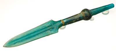來(lái)自湖南博物院的西漢玻璃矛是本次展覽的明星展品之一。玻璃矛為綠色半透明狀,長(zhǎng)18.8厘米,刃寬2.2厘米,矛脊兩側(cè)有槽,矛柄作圓柱狀,柄中部凸起成圓球形。這種兵器造型的玻璃制品非常罕見(jiàn),專(zhuān)家推測(cè)其為禮器或明器。這件玻璃矛是本土工匠在吸收地中海玻璃制造技術(shù)的基礎(chǔ)上制作而成,反映了西漢玻璃工藝的高超水平,是研究玻璃文化傳播的重要實(shí)物資料。