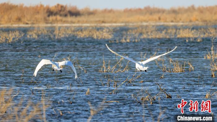中新網(wǎng)烏魯木齊11月15日電(年磊)11月14日,位于新疆維吾爾自治區(qū)巴音郭楞蒙古自治州博湖縣境內(nèi)的博斯騰湖白鷺洲迎來大批天鵝,它們?nèi)宄扇航Y(jié)伴游弋,嬉戲追逐,優(yōu)雅的身姿成為博斯騰湖一道靈動(dòng)的風(fēng)景線。