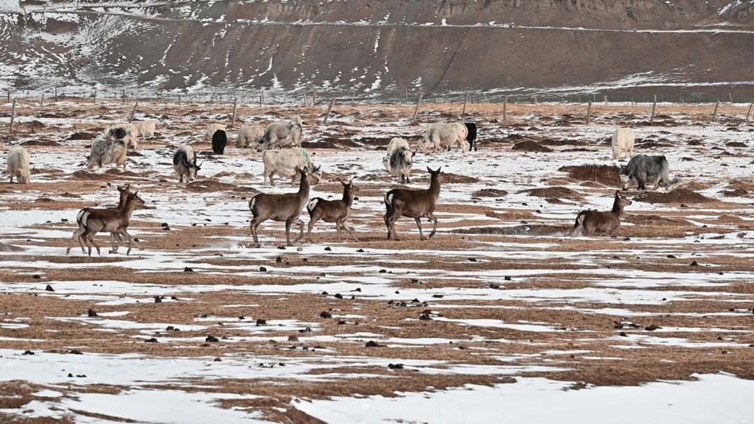 近日,在武威市天祝藏族自治縣抓喜秀龍草原上,野生的狍鹿和牧民家養(yǎng)的白牦牛同食牧草,構(gòu)成一幅和諧動(dòng)人的自然圖景。張廷愛攝。