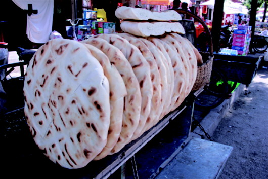 將面粉中加入一定比例的堿水,調(diào)和成面團揉入早發(fā)酵好的面團,然后再添入大量干面,接下來才是關鍵所在:用堅硬、光滑、沉重的木頭杠子一頭固定(形如杠桿),一頭人工操作,反復揉壓面團,直到將干面團壓成綢子一樣綿軟,再切成1斤、2斤或3斤的面劑子,搟成圓餅狀,抹上清油,撒上少許鹽和胡椒、苦豆、姜黃等佐料,最后將面餅卷起來,豎立壓制成團,再用木杠搟壓成厚而大的圓餅,并在上面用干凈的梳齒等工具精心旋出花紋圖案,抹少許清油,便可上鏊烘烤。