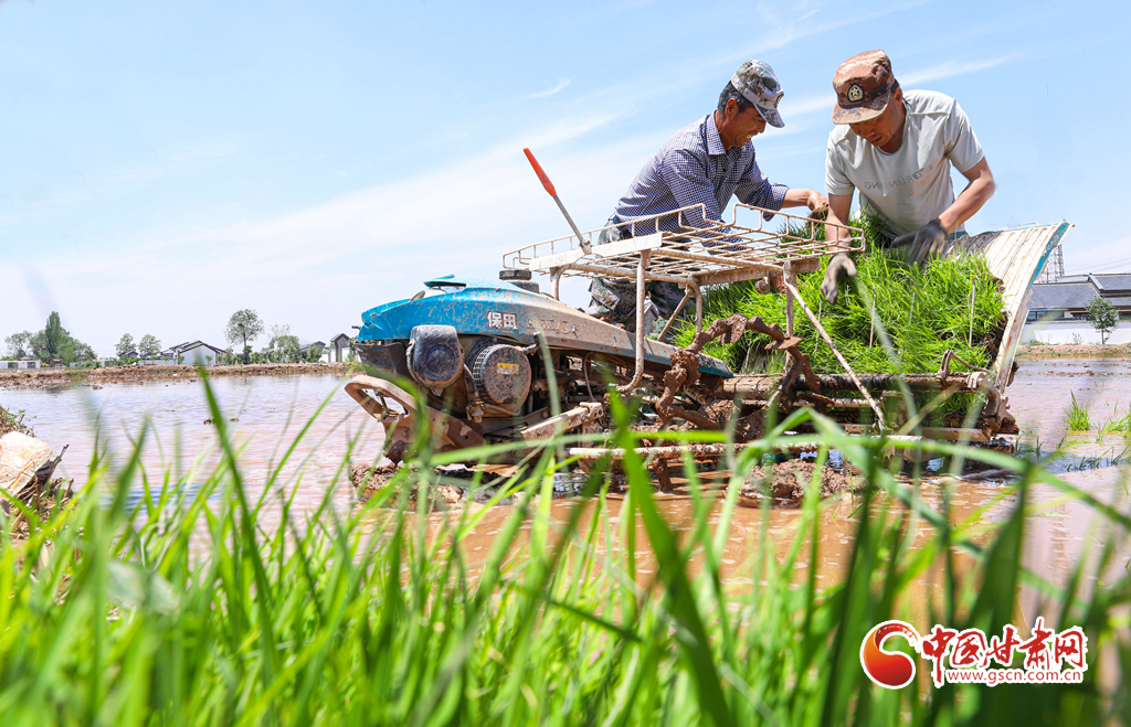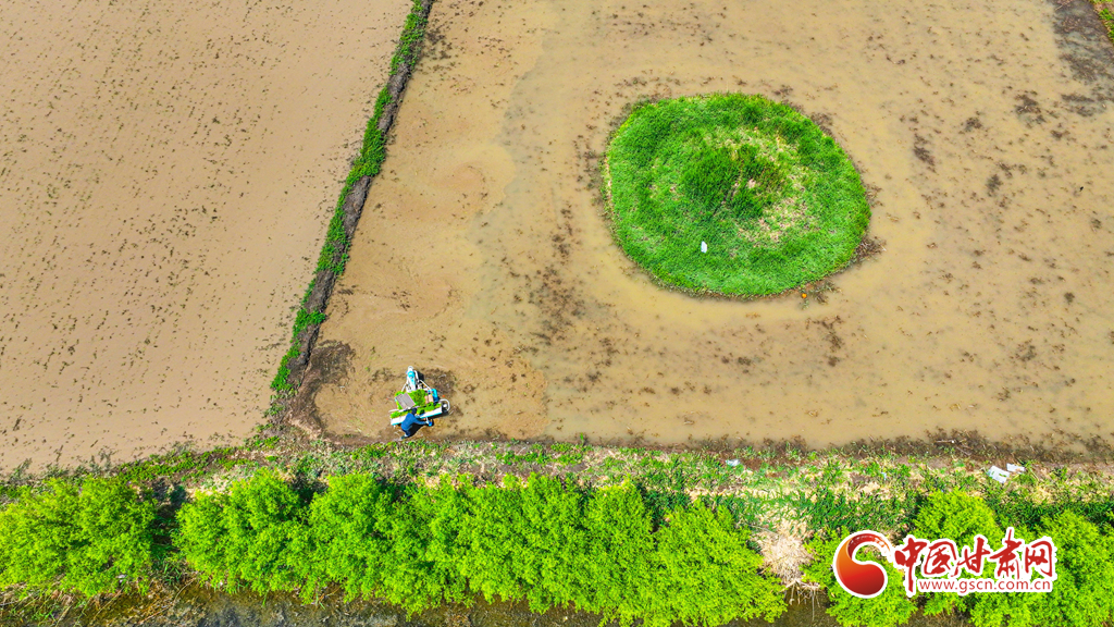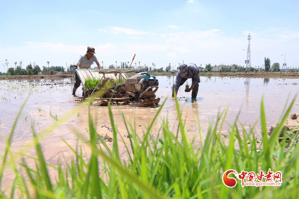 6月5日,祁連山北麓,甘肅省張掖市甘州區(qū)烏江鎮(zhèn)、靖安鄉(xiāng)的稻田里,插秧機同農(nóng)戶來回穿梭插秧,2200多畝稻田進(jìn)入了繁忙插播中。