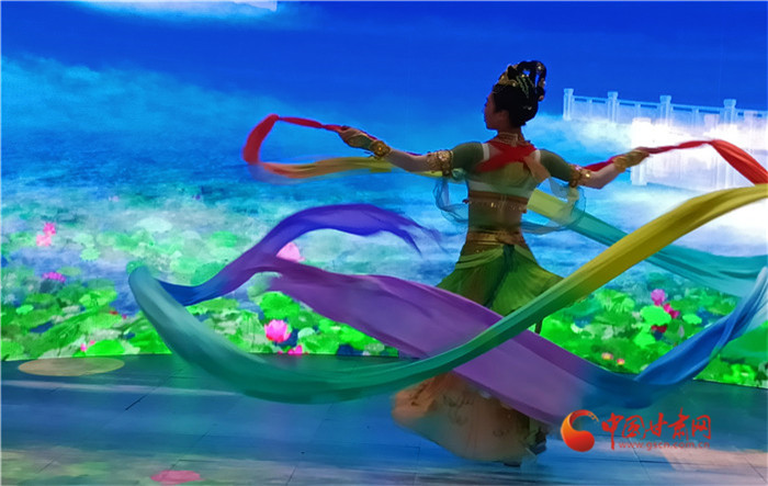 如意甘肅館選擇“以鹿王本生圖”中的綠色作為設(shè)計(jì)的主色調(diào),將敦煌元素鑲嵌在展館各個(gè)角落。特別是門口的展演舞臺(tái),經(jīng)典舞劇《絲路花雨》展演的反彈琵琶、敦煌伎樂天等將觀眾帶入了有聲有色的敦煌,成為如意甘肅館的一大吸睛之處。