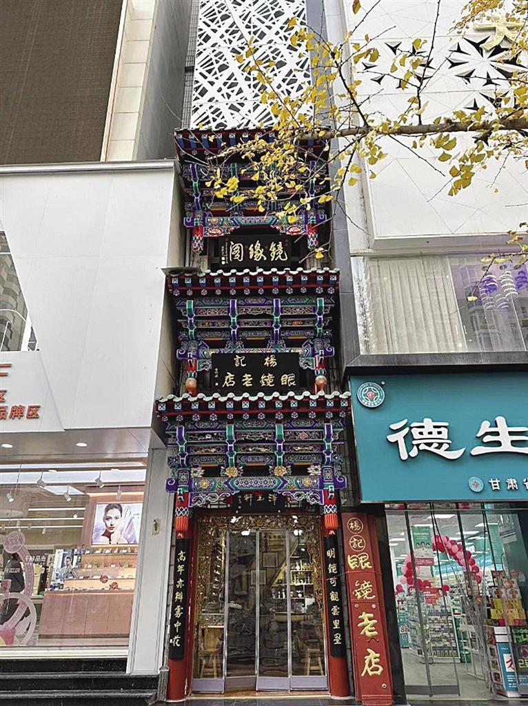 榫卯鑲嵌、手工木雕、精致彩繪、金箔貼邊,在張掖路步行街上,楊記眼鏡行的門樓招牌格外亮眼,雖然只有三四米寬的窄小門面,但店外從上而下的三塊古韻招牌彰顯出這家店的“不簡單”。“最下面這塊‘澤玉軒’的招牌是我家祖輩楊澤玉開創(chuàng)這家眼鏡行時留下的字號”,楊記眼鏡行是蘭州一家老字號的石頭眼鏡售賣和維修小店,光是制作修理石頭眼鏡這項(xiàng)手藝就已經(jīng)傳到了第五代,其店鋪在二十世紀(jì)八九十年代就獲得過商務(wù)部的“中華老字號”認(rèn)可。