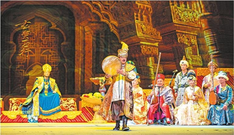 全劇主體部分由“佛門”“一念”“潛關(guān)”“問路”“遇險”“極樂”“高昌”“普度”“雪山”“祭天”“菩提”“那爛陀”“如夢”“大唐”14個章節(jié)構(gòu)成。每一個章節(jié)都把樂器與故事相結(jié)合,推動情節(jié)發(fā)展,表現(xiàn)人物內(nèi)心,從漢族傳統(tǒng)樂器笛、簫、塤、箏、鼓,到維吾爾族樂器艾捷克、薩塔爾、都塔爾,哈薩克族樂器冬不拉、庫布孜,塔吉克族樂器鷹笛、莎什塔爾,還有敦煌復(fù)原樂器箜篌、排簫、五弦琵琶,印度傳統(tǒng)樂器班蘇里笛等,呈現(xiàn)出來的樂器數(shù)量,令人驚嘆。據(jù)姜瑩介紹,全劇共演奏中外傳統(tǒng)樂器70余種。在舞臺呈現(xiàn)上,多媒體技術(shù)、舞美、燈光及服裝的綜合運(yùn)用,情景交融,新穎而獨(dú)特,給人一種身臨其境的真實(shí)感,沿著玄奘前行的足跡,大漠、星空、雪山……如在眼前。此外,劇目跨越時空,讓老年玄奘和青年玄奘隔空對話,將遼闊的時空壓縮于舞臺一瞬,以強(qiáng)烈的穿透力給觀眾以心靈上的啟迪和震顫。高昌王以樂會友部分,演奏人員從觀眾席上的出場,既讓人驚喜,也是一種沉浸式的觀看體驗(yàn),強(qiáng)烈的互動性和感染力,點(diǎn)燃了觀眾的熱情。