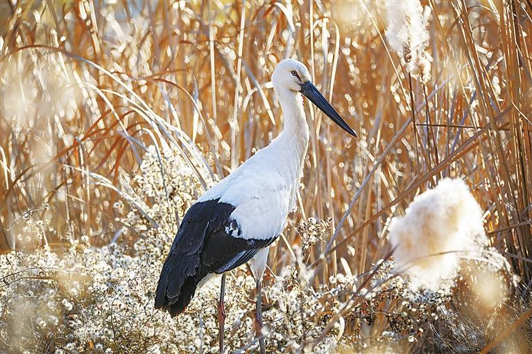 東方白鸛是一種大型涉禽,為鸛形目鸛科鳥類。其體態(tài)優(yōu)美,成鳥體長(zhǎng)超過(guò)1米,黑翅白體,赤腳長(zhǎng)喙,棲息于開闊的沼澤、湖泊和潮濕草地。東方白鸛是少見的旅鳥,因繁殖分布區(qū)域狹窄,野生種群數(shù)量極為稀少,在《世界自然保護(hù)聯(lián)盟瀕危物種紅色名錄》中屬于瀕危等級(jí),是我國(guó)一級(jí)重點(diǎn)保護(hù)野生動(dòng)物,有“鳥界國(guó)寶”“鳥類大熊貓”之稱。