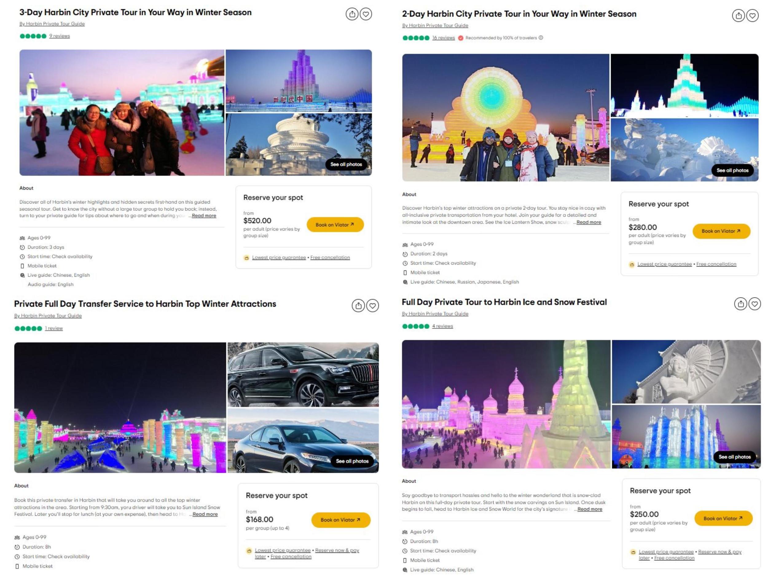 中新財(cái)經(jīng)查看Tripadvisor網(wǎng)站發(fā)現(xiàn),該平臺(tái)上有數(shù)十個(gè)關(guān)于哈爾濱旅游的服務(wù)。其中,“哈爾濱市冬季私人三日游”每位成人收費(fèi)520美元起,“哈爾濱市冬季私人兩日游”每位成人收費(fèi)280美元起,這兩個(gè)服務(wù)的費(fèi)用不包括門票,包括私人導(dǎo)游服務(wù)、交通費(fèi)(私人汽車或公交車/出租車)、酒店接送;“哈爾濱冬季熱門景點(diǎn)私人全日接送”每團(tuán)收費(fèi)168美元起(最多4人),費(fèi)用不包括門票等,包括私人汽車、私人司機(jī)服務(wù)、燃油附加費(fèi)。