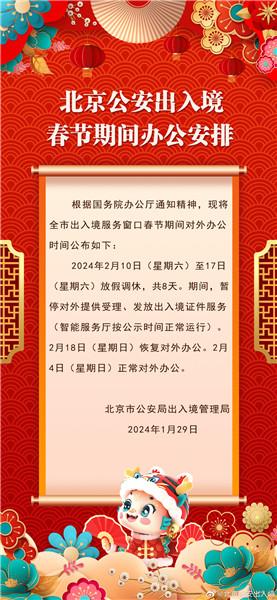 據(jù)北京市公安局出入境管理局官方微博消息,北京市公安局出入境管理局發(fā)布春節(jié)期間辦公安排:北京市出入境服務窗口2月10日至17日(大年初一至初八)放假調(diào)休,共8天。期間,暫停對外提供受理、發(fā)放出入境證件服務(智能服務廳按公示時間正常運行)。