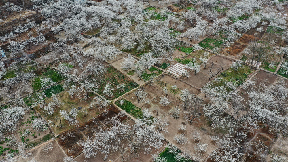 這是3月9日在隴南市武都區(qū)城關(guān)鎮(zhèn)石家莊村拍攝的櫻桃花(無(wú)人機(jī)照片)。 新華社記者 陳斌 攝