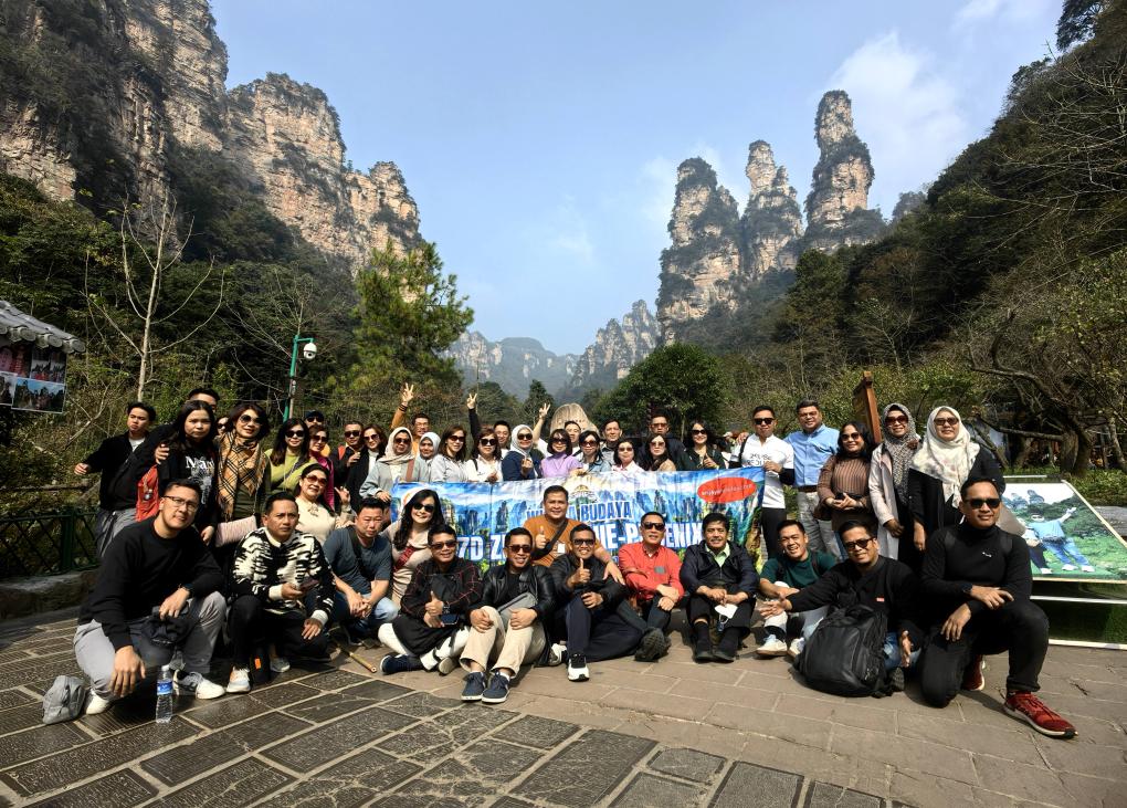 11月5日,來(lái)自印度尼西亞的團(tuán)隊(duì)游客在張家界國(guó)家森林公園留影。(吳勇兵 攝)