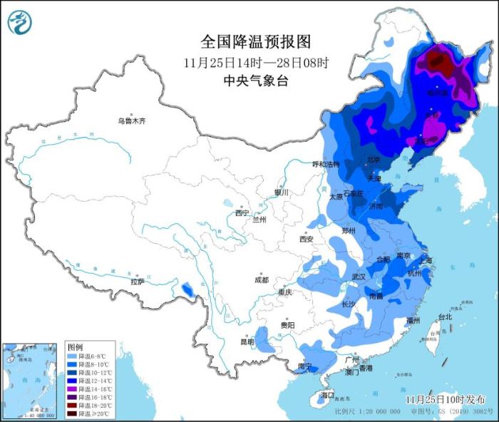 預計,11月25日14時至11月27日14時,內蒙古中東部、華北、東北地區(qū)中南部、黃淮、江淮、江漢東部、江南北部等地將先后降溫6~10℃,其中,內蒙古中部、華北北部、東北地區(qū)中南部等地部分地區(qū)降溫可達12℃以上。