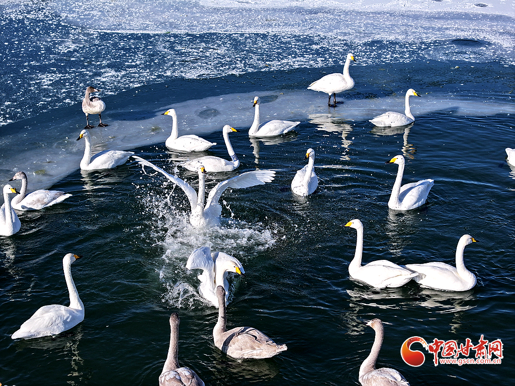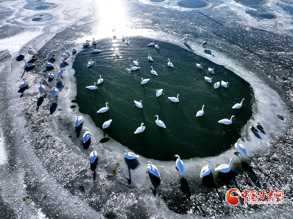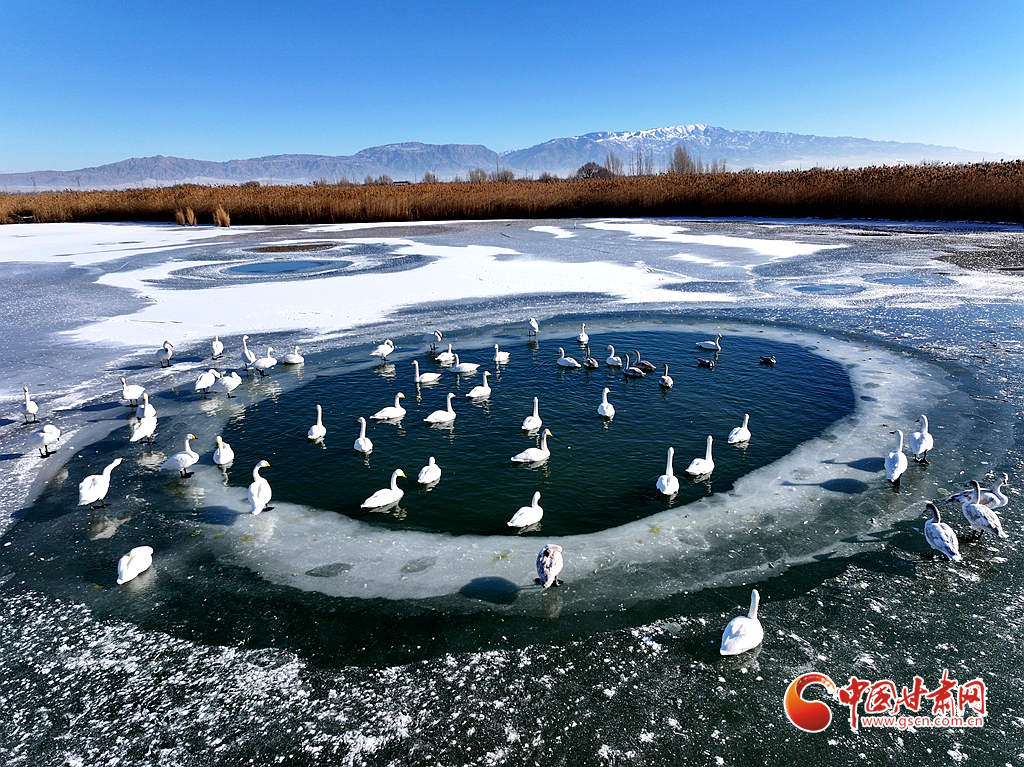 近日,在甘肅省張掖國家濕地公園,成群的越冬天鵝在冰封的湖面上悠然覓食、嬉戲,構(gòu)成了一幅動(dòng)人的生態(tài)畫卷,成為冬日里一道尤為引人注目的風(fēng)景線。
