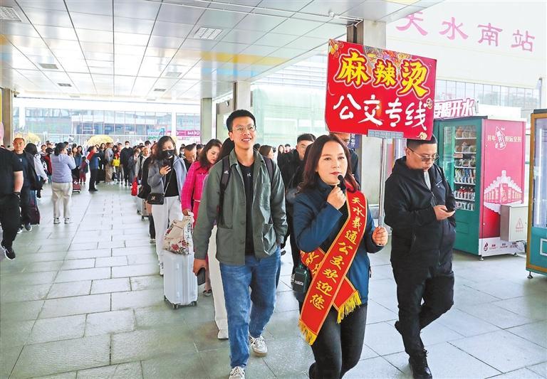 2024年4月3日,志愿者在天水南站引導(dǎo)游客乘坐免費(fèi)的“麻辣燙公交專線”。新甘肅·甘肅日報(bào)記者 高檣