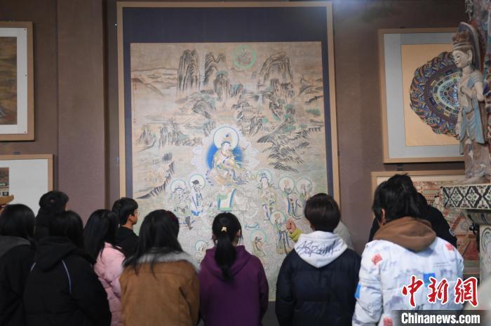 1月14日,甘肅省酒泉市,甘肅酒泉職業(yè)技術(shù)學(xué)院非物質(zhì)文化遺產(chǎn)敦煌彩塑技藝傳習(xí)所內(nèi),學(xué)生們參觀敦煌壁畫作品。中新社記者 李亞龍 攝