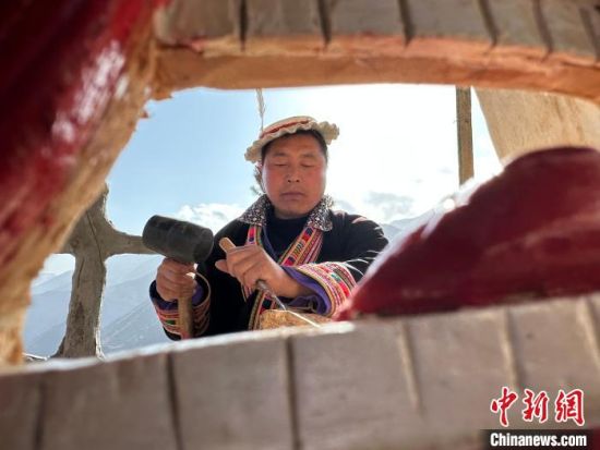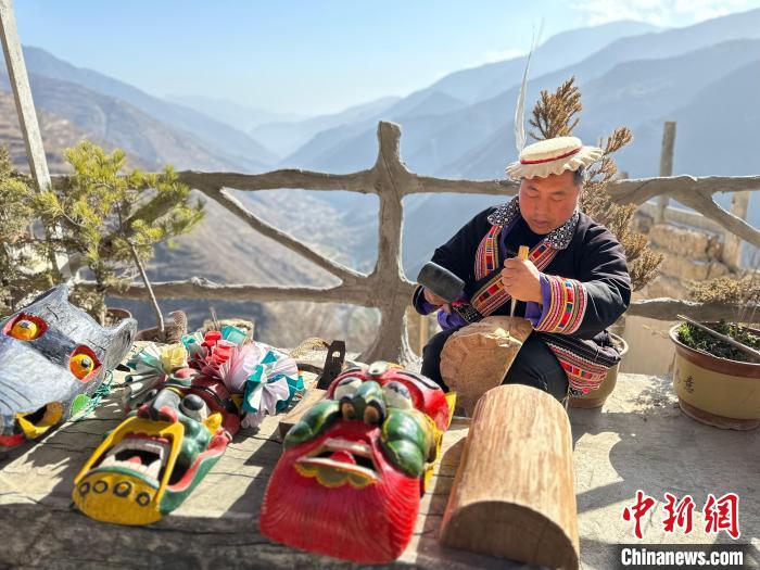 雕刻、打磨、上色……甘肅隴南市文縣鐵樓藏族鄉(xiāng)強(qiáng)曲村,白馬人薛剛一家四代人都精于木工。日前中新網(wǎng)記者走訪村子時,薛剛坐在自家院子里,伏案制作池哥晝所用面具。池哥晝是白馬人保留最完整、最具特色民族舞蹈,面具是重要道具之一。薛剛制作的面具不僅用于周邊村子的池哥晝中,而且被廣州、上海等地的客商購買收藏。他時常將自己的想象融入面具中,用心打磨使其更具“靈氣”。他說,白馬人中從事面具雕刻的手藝人不多,最近他物色了一個“00后”徒弟,對方興趣濃厚,希望將這門手藝保護(hù)傳承好。圖為薛剛在院子里雕刻面具。閆姣 攝