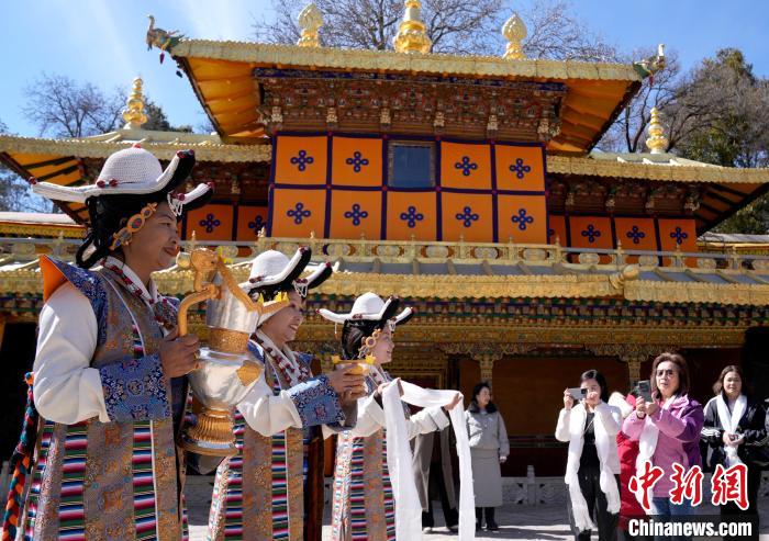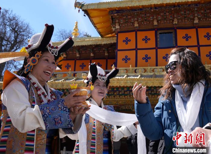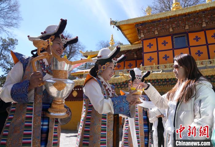 2月20日,由西藏自治區(qū)文化和旅游廳舉辦的2025年香港至拉薩航班首航旅行團(tuán)歡迎儀式在羅布林卡舉行。來(lái)自香港的游客將前往布達(dá)拉宮、大昭寺等地,開(kāi)啟冬游西藏旅途。2月19日,拉薩至香港的首條地區(qū)航線正式開(kāi)通。航線的開(kāi)通,更加便捷了兩地居民的出行,也將進(jìn)一步促進(jìn)兩地在旅游、文化、經(jīng)貿(mào)等領(lǐng)域的交流與合作。圖為歡迎儀式現(xiàn)場(chǎng),工作人員向香港游客敬獻(xiàn)青稞酒。中新社記者 李林 攝
