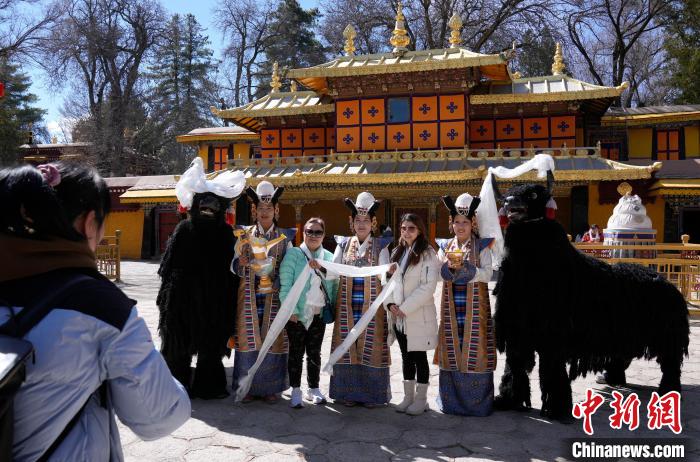 圖為歡迎儀式現(xiàn)場(chǎng),香港游客在羅布林卡與工作人員合影留念。中新社記者 李林 攝