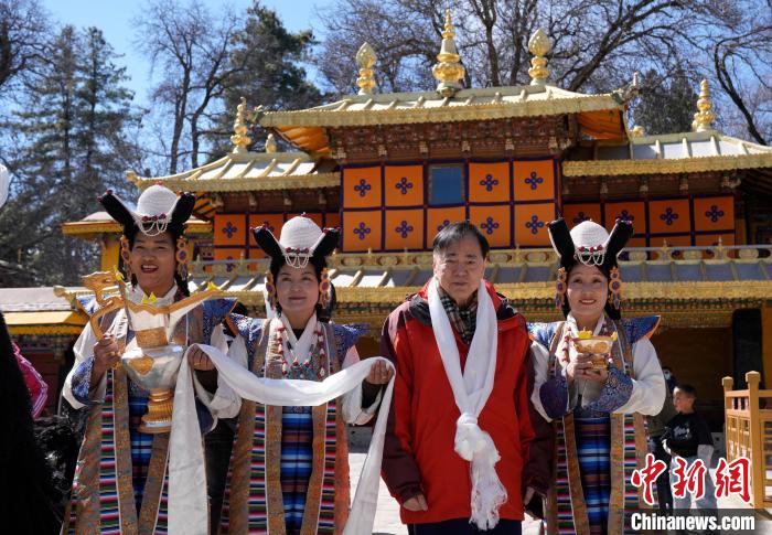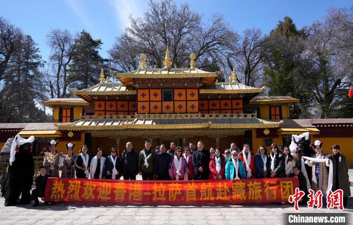 圖為歡迎儀式現(xiàn)場(chǎng),香港游客在羅布林卡與身著拉薩傳統(tǒng)服飾的工作人員合影留念。中新社記者 李林 攝