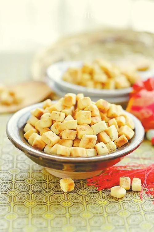 做面棋子,先和面。面里最好加豬油、雞蛋,攪拌均勻,加水,再揉,揉好面,搟開。不能太薄,也不能太厚,約半本語文書那般寬度即可。然后切,切成菱形,拇指大小,撒面,一拌,以防粘連。麥草燒鍋,鍋熱,放油。油熱,冒微煙,把面棋子放進鍋,反復翻炒,直到微黃。炒熟后,熄火,不蓋鍋蓋,再到鍋里“焙”(烤的意思)一陣,直到用勺子舀起,又倒下去,鐵鍋里叮當有聲即可。
