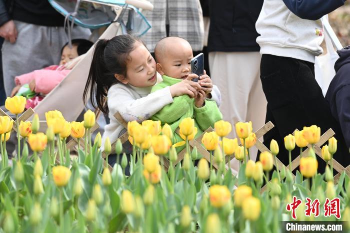 圖為姐姐教弟弟拍攝郁金香。中新社記者 楊華峰 攝