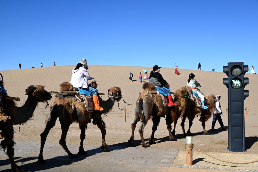 5月24日,敦煌市鳴沙山月牙泉景區(qū)的交通信號燈“綠駱駝燈”亮起時(shí),農(nóng)戶牽著駱駝有序通過。敦煌市鳴沙山月牙泉景區(qū)設(shè)置具有駱駝元素的交通信號燈,保障了景區(qū)交通安全順暢。新華社發(fā)(張曉亮攝)