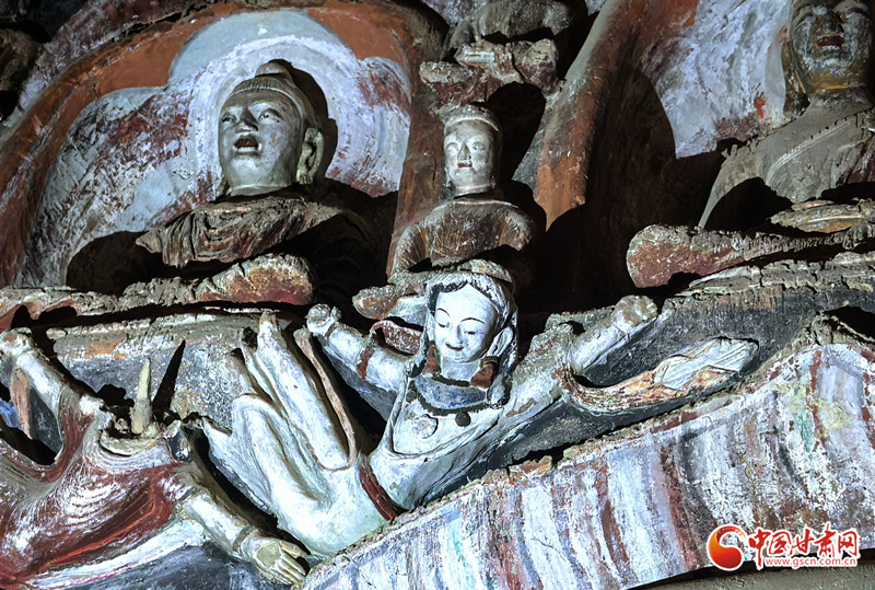 這里最具特色的是東窟一層龕楣兩側(cè)懸塑的飛天,相對作凌空飛舞之勢。金塔寺內(nèi)的高肉雕彩塑飛天歷史遠(yuǎn)早于敦煌飛天,屬洞窟藝術(shù)之罕見珍品,為全國僅有。