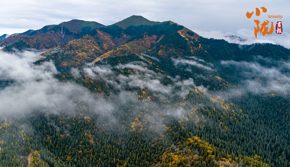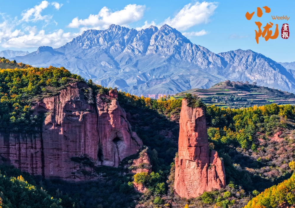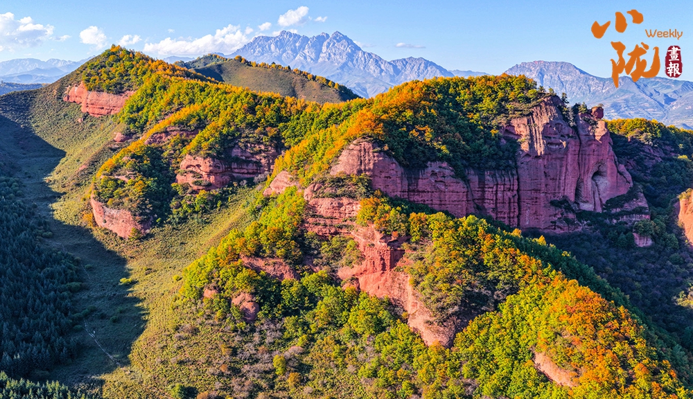俯瞰整個冶力關(guān),遠處的雪峰在陽光照耀下泛著銀光,與近處的彩林形成鮮明對比,宛如一幅氣勢磅礴的山水畫卷。
