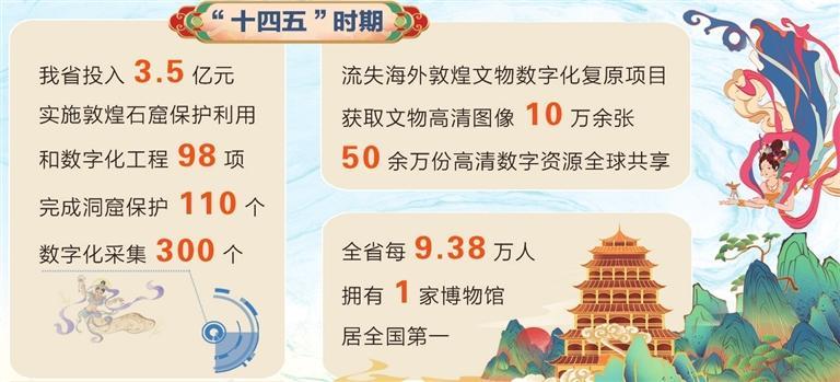 在文物保護提質升級方面,我省投入3.5億元,實施敦煌石窟保護利用和數字化工程98項,完成洞窟保護110個、數字化采集300個,建成全球首個文物保護多場耦合實驗室,制定國家和行業(yè)標準27項,科研成果服務16省市及部分共建“一帶一路”國家;流失海外敦煌文物數字化復原項目獲取文物高清圖像10萬余張,50余萬份高清數字資源全球共享;第四次全國文物普查新發(fā)現線索4659條,投入24.26億元實施900余項重要文保項目;打造河西走廊國家遺產線路,創(chuàng)建嘉峪關長城國家文物保護利用示范區(qū),全省文物系統(tǒng)性保護成效顯著,“中國特色?敦煌經驗”國際影響力持續(xù)提升。