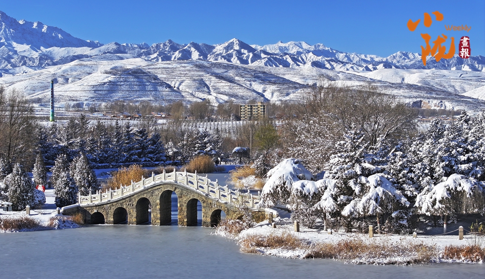 雪后初霽,銀白的民樂公園,在陽光下熠熠生輝,安靜且神秘,與遠處綿延的祁連山構成一幅璀璨的畫卷。