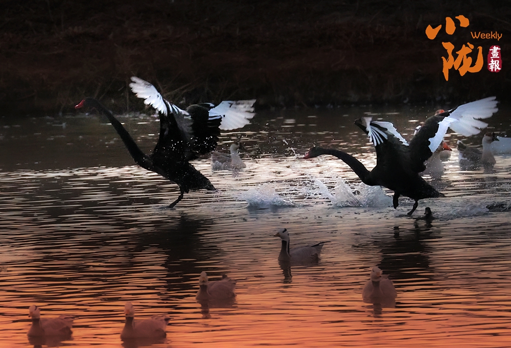 這里聚集了黑鸛、白鷺、鴛鴦、天鵝、赤麻鴨、灰雁等多種水鳥,它們在黃昏里愜意地游弋,或扎進(jìn)水里捕魚,或相互追逐戲水的畫面,既震撼又溫柔,成為攝影愛好者和游人爭相追逐的“冬日奇景”。