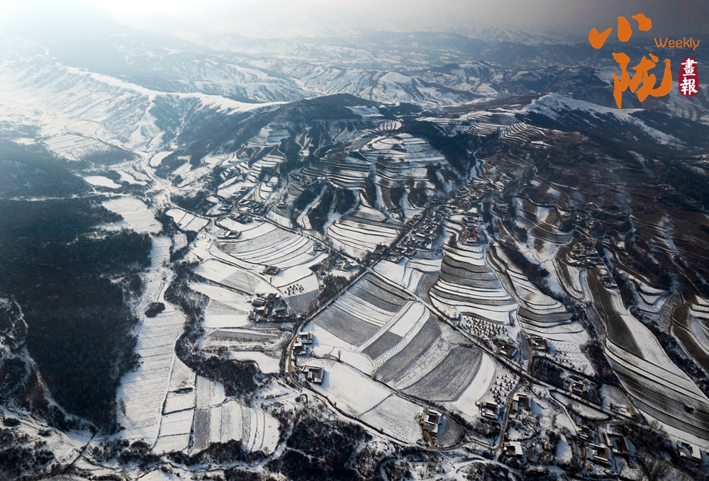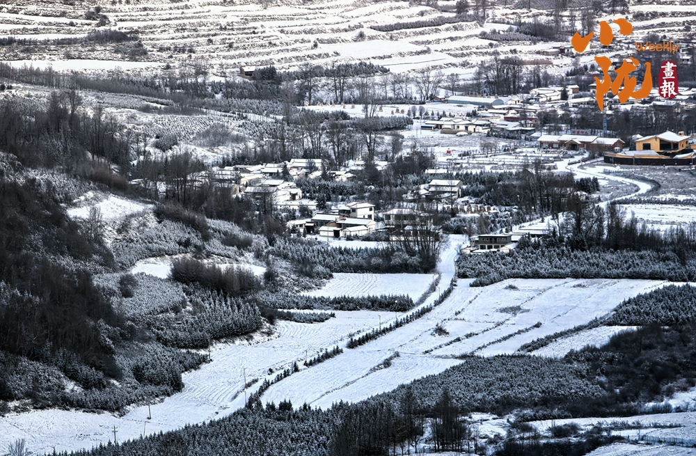 道路、溝壑、樹木、村落,被皚皚的白雪所覆蓋,呈現(xiàn)出一片“雪落山川白,美景入畫來”的美麗景象。